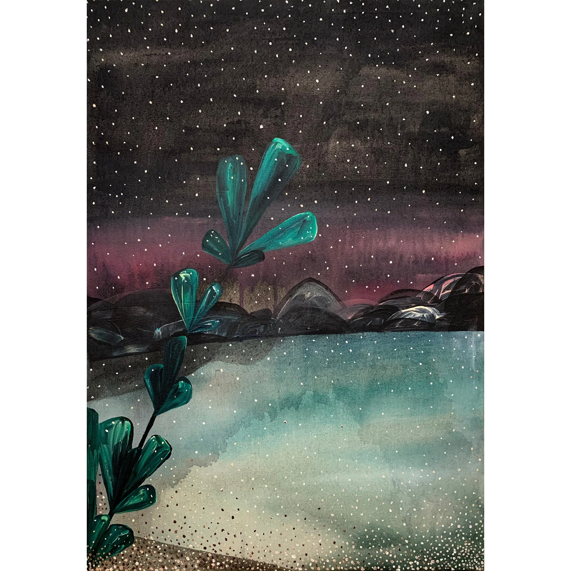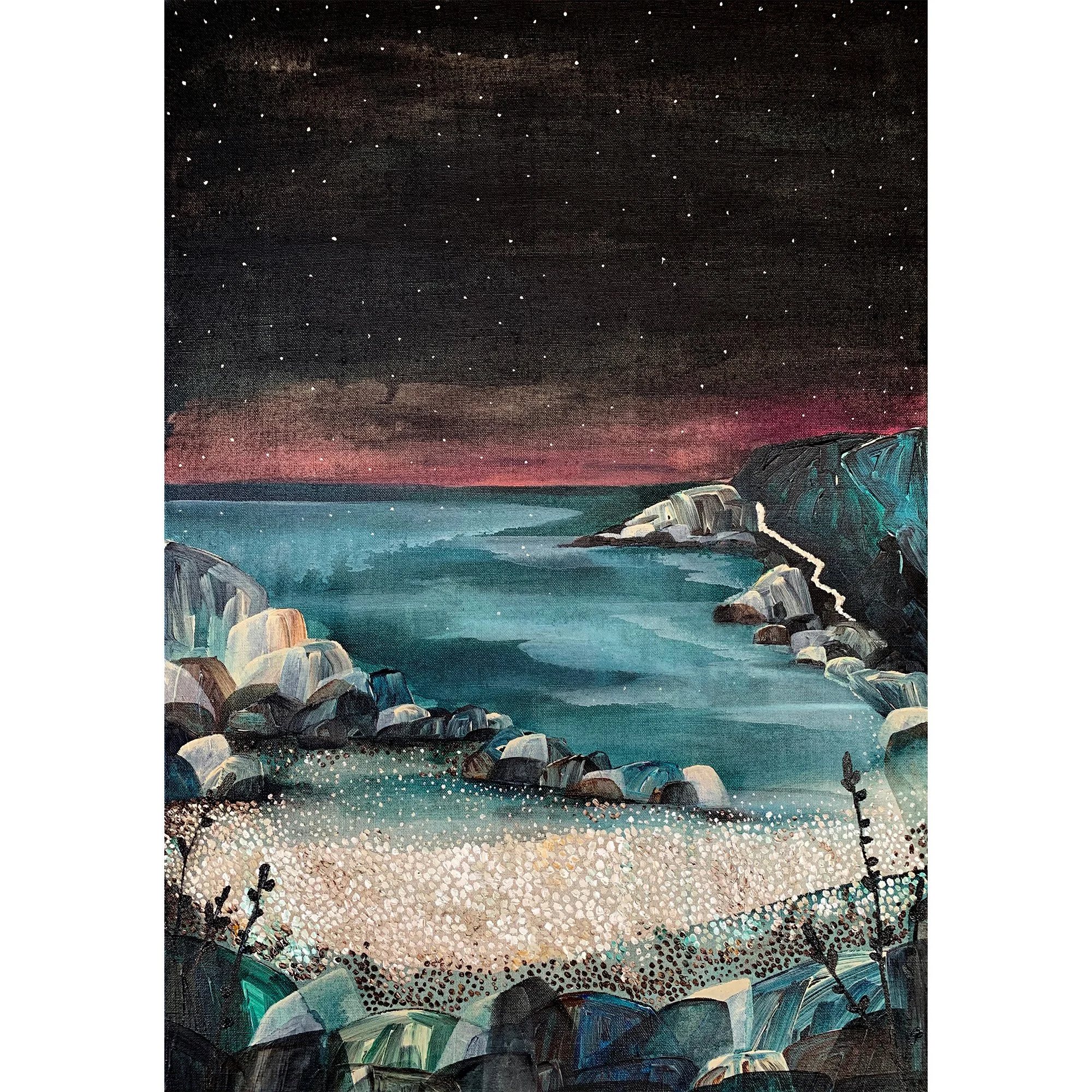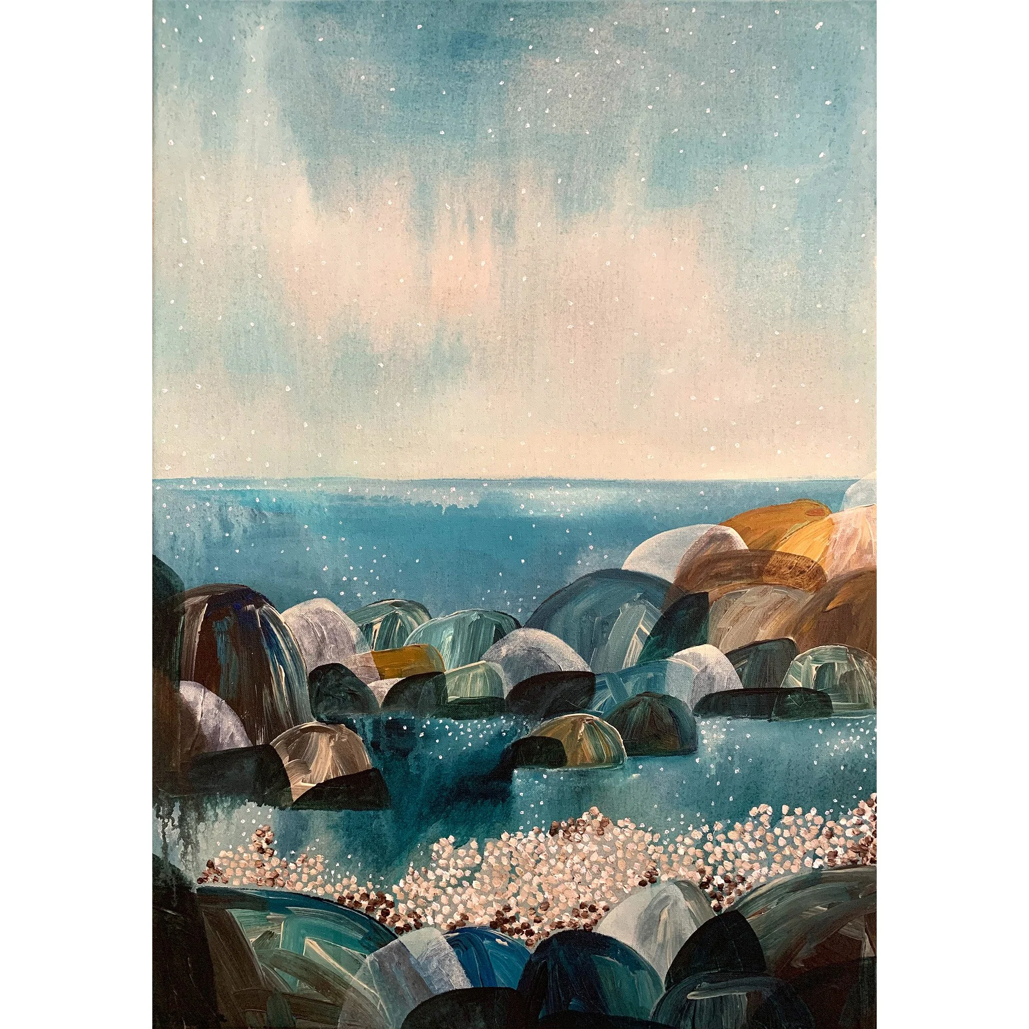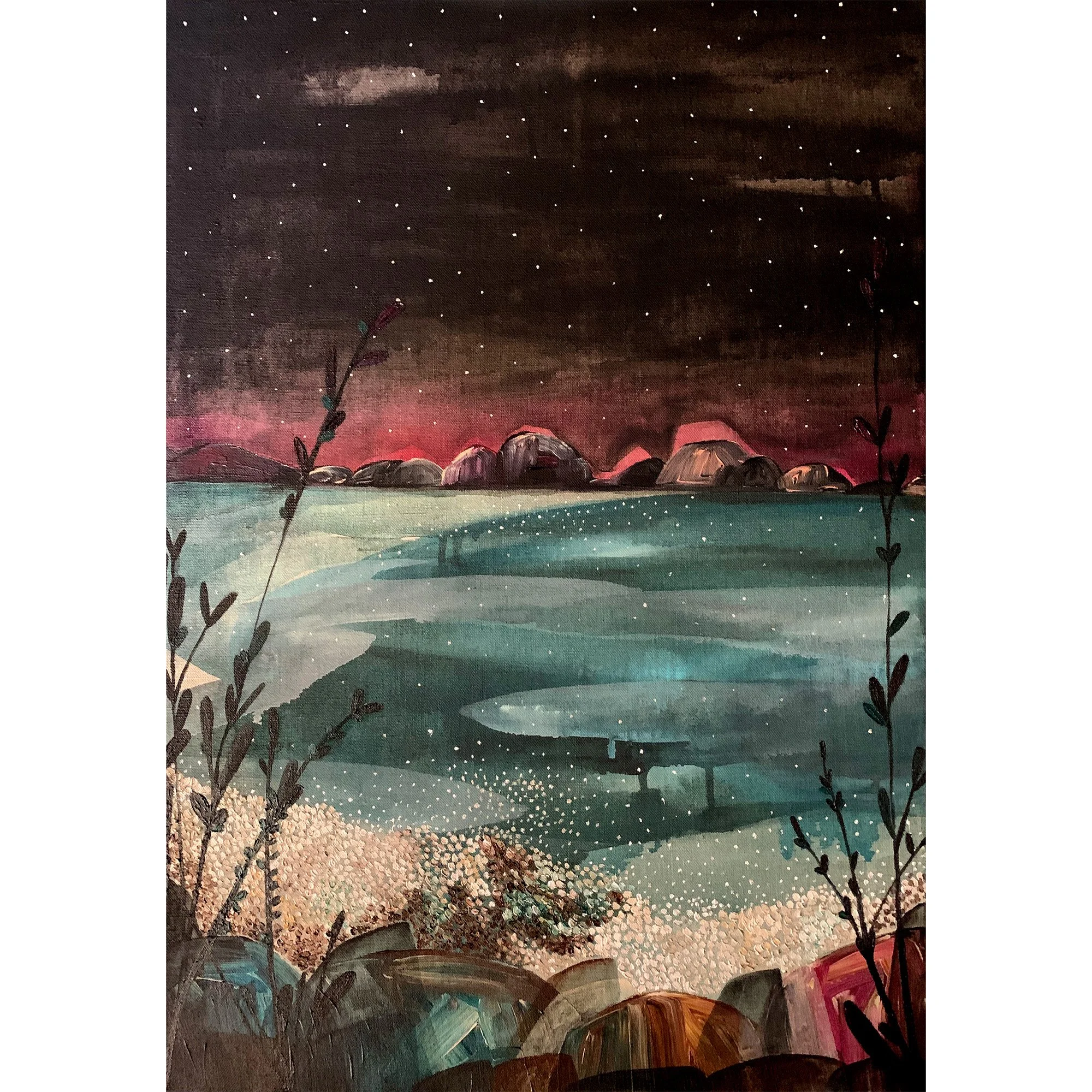 ‘Shells litter the edge of the lagoon and stars dance in the sunshine’ 2022 45cm x 65cm Acrylic and Oil Belgian Linen