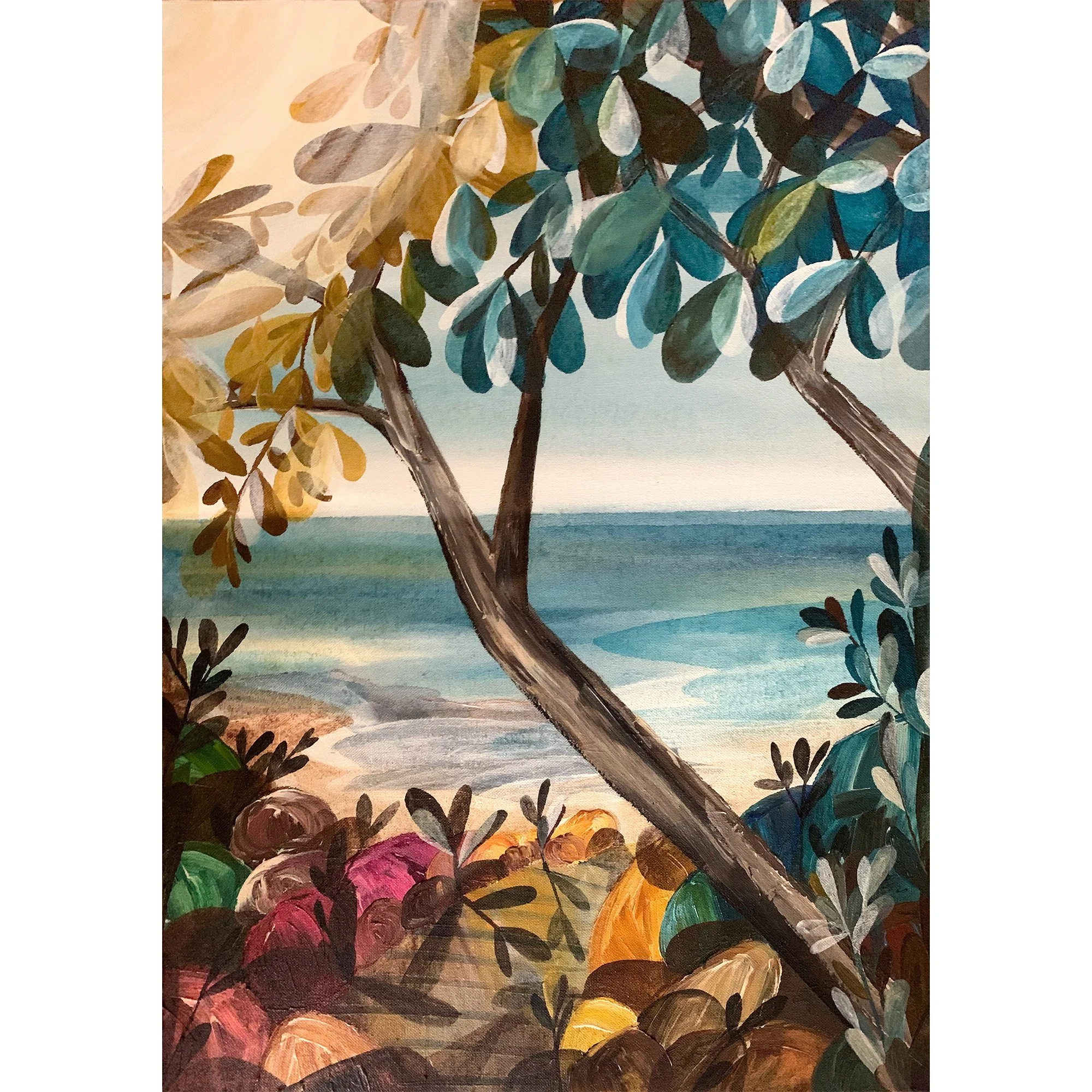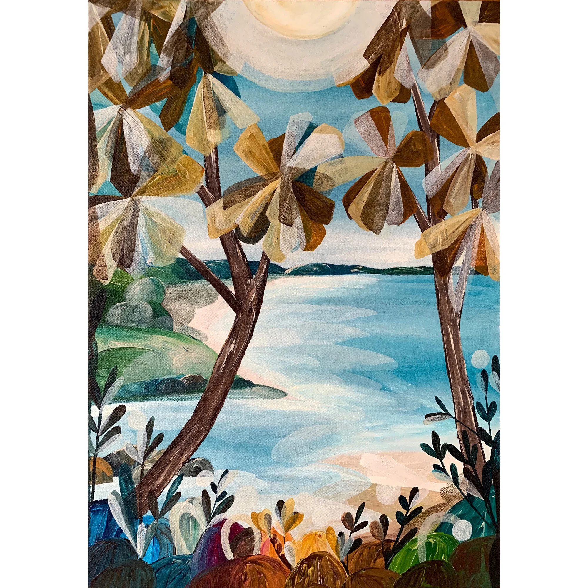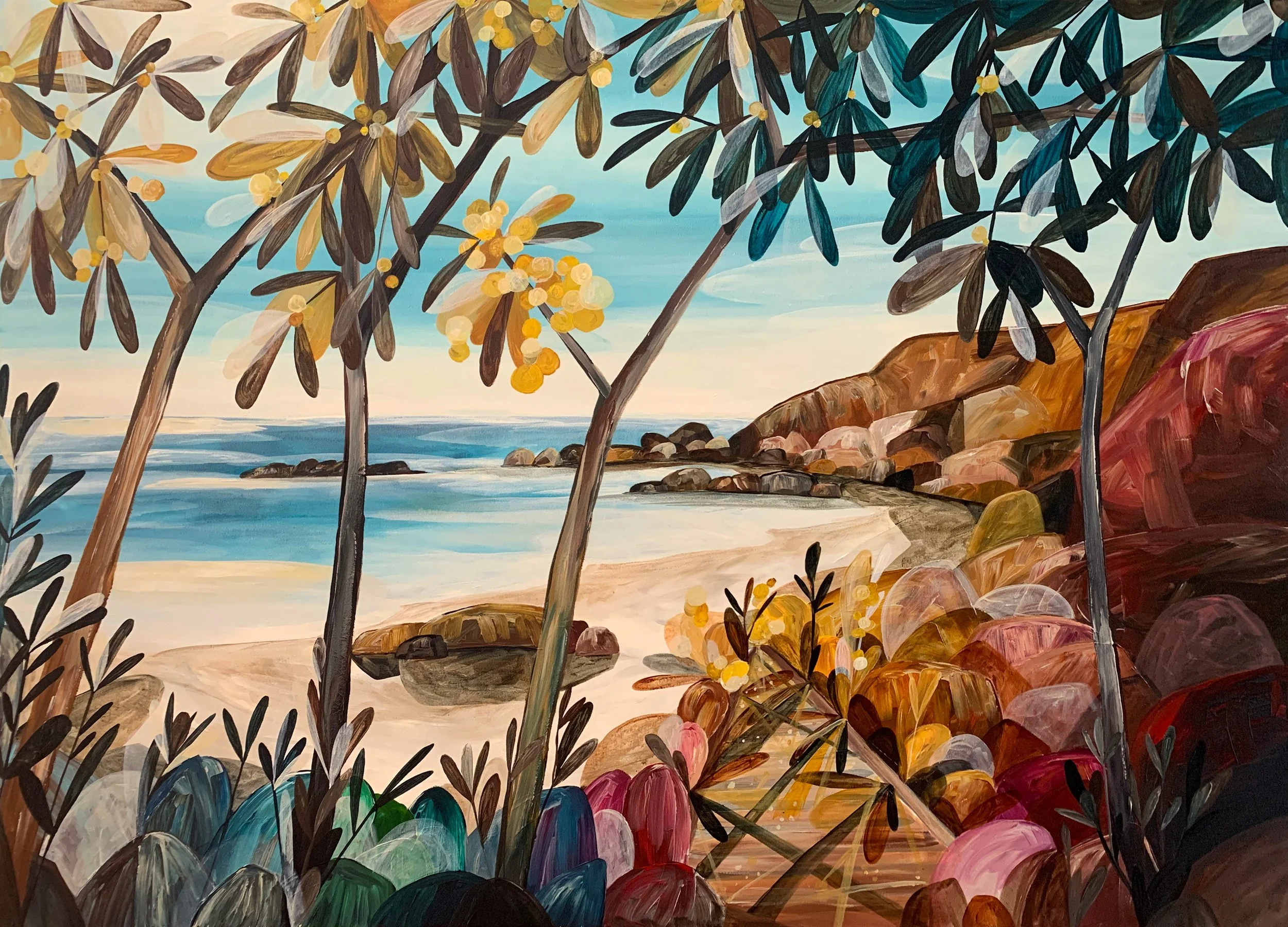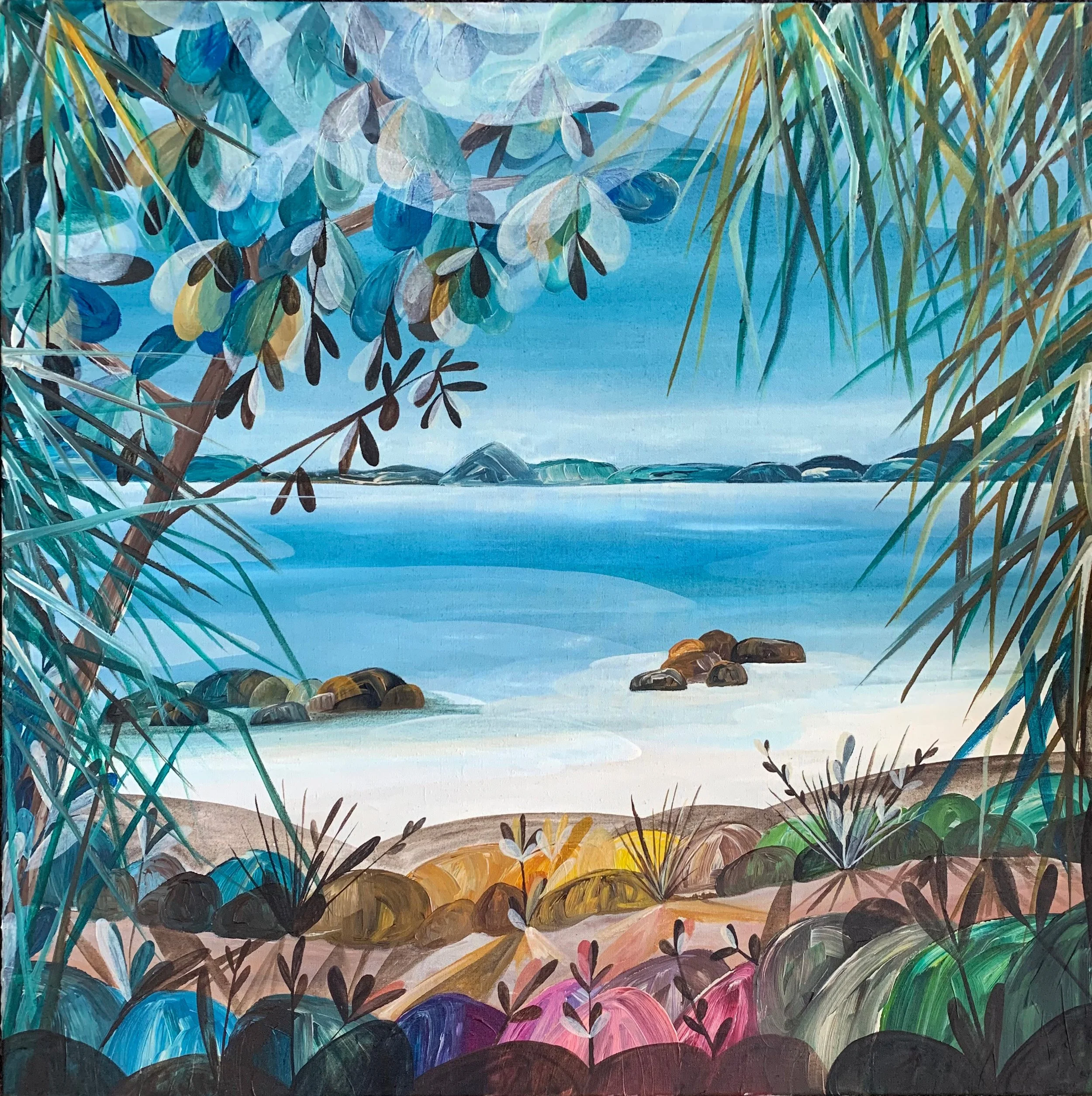 ‘Dancing in the sunshine, diving into the cool lagoon’ (Larapuna) 2021 68cm x 48cm Synthetic Polymer on Belgium Linen